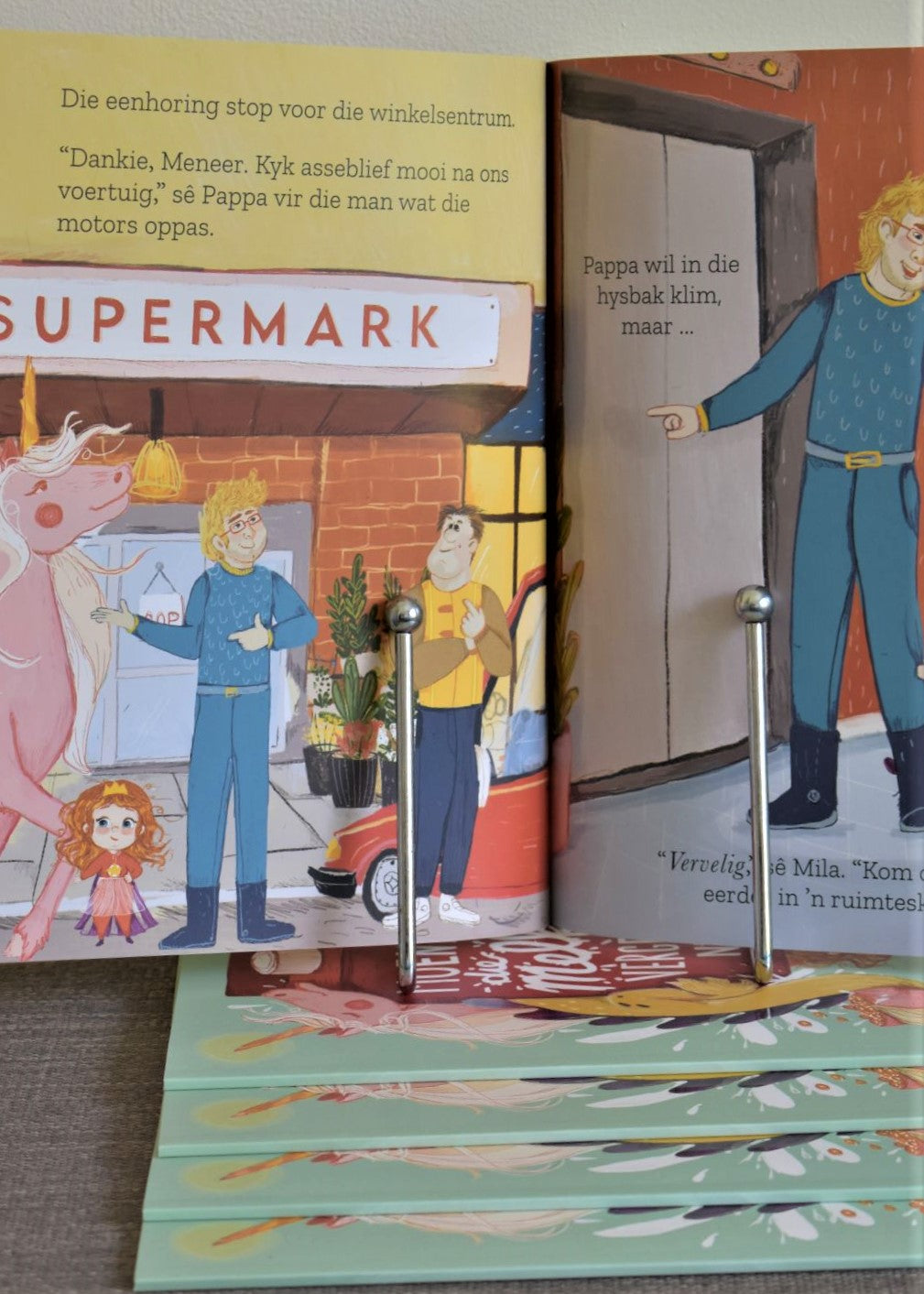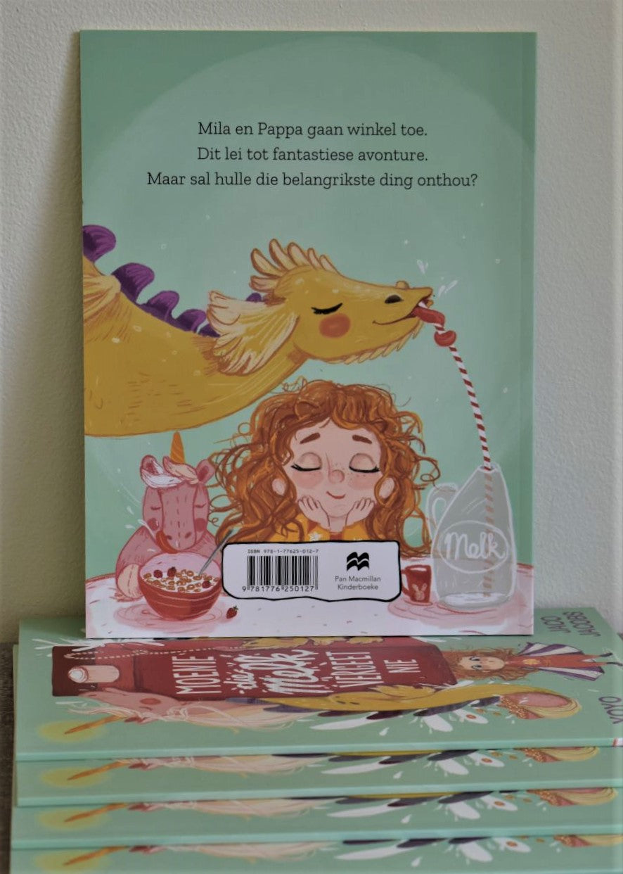 Mamma stuur vir Mila en Pappa winkel toe om melk te gaan koop. Wat gewoonlik ’n vervelige en voorspelbare uitstappie is, word ’n onvergeetlike avontuur. Hulle ry op ’n eenhoring, vlieg in ’n ruimtetuig, koop kos vir Mila se troeteldraak en kom soos wafferse superhelde tot die redding toe ’n reuse-toring blikkieskos amper omval. Daar is net een probleem – hulle het sowaar die melk vergeet!