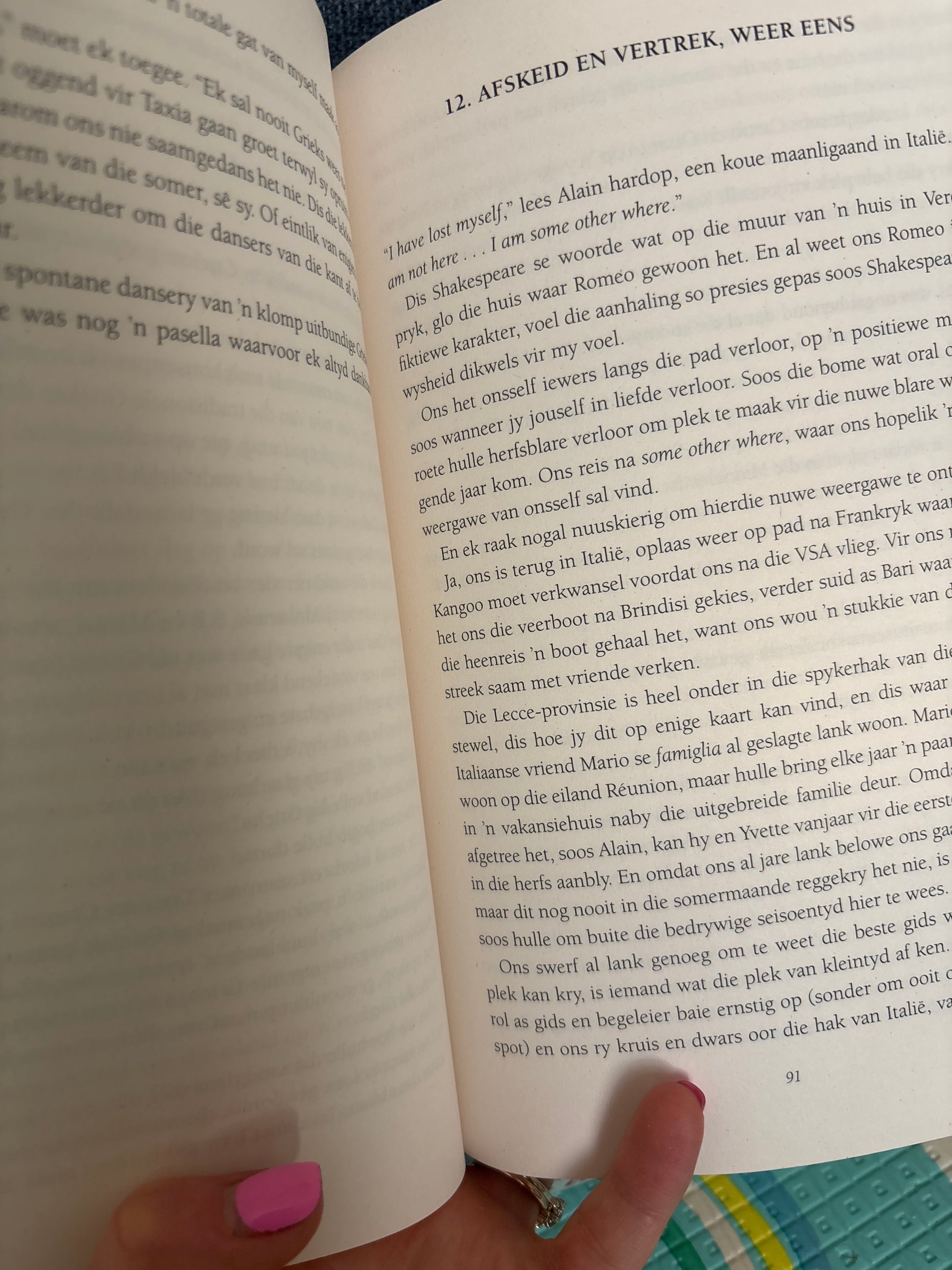 Toe Covid-19 die mat onder Marita van der Vyver en haar Fransman se voete uitruk en hulle noodgedwonge hul ou groot huis op die Franse platteland moes verkoop, besluit hulle om die meeste van hulle aardse besittings ontslae te raak en ver in die wêreld te gaan reis. In hierdie reis, wat oor drie vastelande strek, word ’n hele leeftyd se herinneringe ontgin.